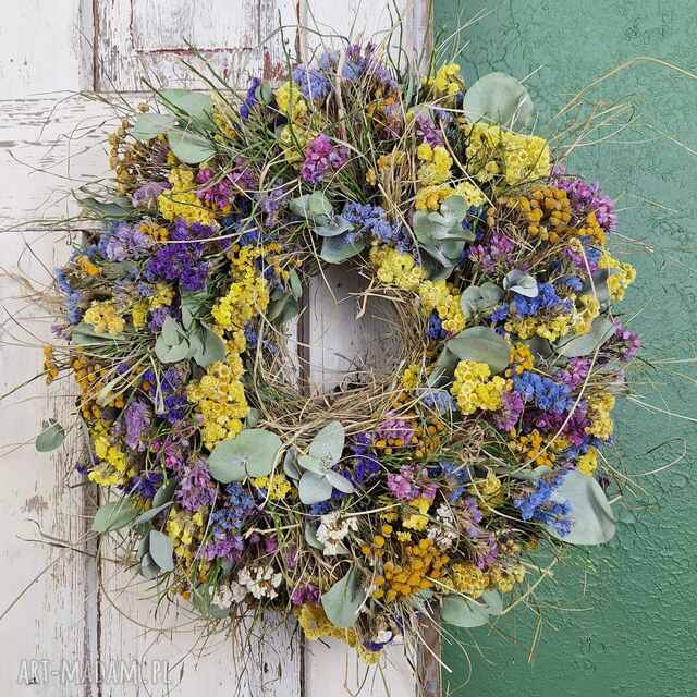 Dekoracja z suszonych kwiatów i traw wykonana jest na słomianym wianku owinietym naturalną tkaniną - juta. Posiada zawieszkę. Łatwo zamocować na drzwiach czy ścianie.