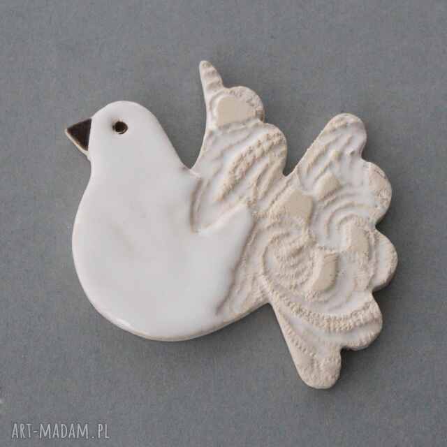 Magnes ceramiczny (możliwość zamówienia także jako zawieszka) GOŁĄBEK w odcieniach bieli, beżu i brązu. Idealny jako oryginalne podziękowanie dla gości z okazji Chrztu Św., czy I Komunii Św. Szkliwiony z jednej strony. Kolory na zdjęciach mogą się różnić, ze względów na ustawienia parametrów monitora. Przy zamówieniu większej ilości cena do ustalenia.