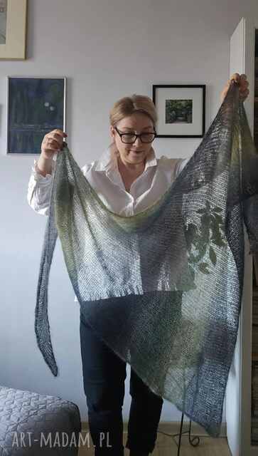 Chusta wykonana na drutach z wysokiej jakości moheru i jedwabiu, duża i lekka, idealny dodatek do różnych stylizacji oraz praktyczne okrycie ramion na plaży.