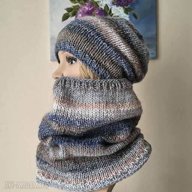 "W chmurach" to kolejny projekt z mojej autorskiej i bardzo od lat lubianej, kolekcji. Miły, ciepły, lekki bezszwowy komplet (robiony naokoło, a nie zszywany), wykonany jest ręcznie na drutach z doskonałej hiszpańskiej włóczki o składzie: 53% wełna, 47% akryl. Włóczka jest delikatna, przyjemna dla skóry, a gama kolorystyczna interesująca i bardzo twarzowa. Komplet doskonale ochroni przed zimnem, doda też charakteru różnym stylizacjom. Jest otulający i i świetnie się układa. Wymiary: czapka dł. 26,5 cm, polecam dla obwodów głowy 55-58 cm., komin szer. 56 cm (góra), 66 cm. (dół), dł. komina 40 cm. Są to wymiary na płasko, bez rozciągania itp. Pranie ręczne.