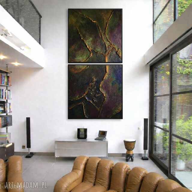 Uniwersalny komplet obrazów 2szt 120120cm, który można zawiesić razem lub osobno - jako spójne, nawiązujące do siebie elementy dekoracji wnętrza. W wersji łączonej tworzy dużą, wyrazistą dekorację ścienną, idealną na wysokie i rozległe ściany, np. przy antresolach.