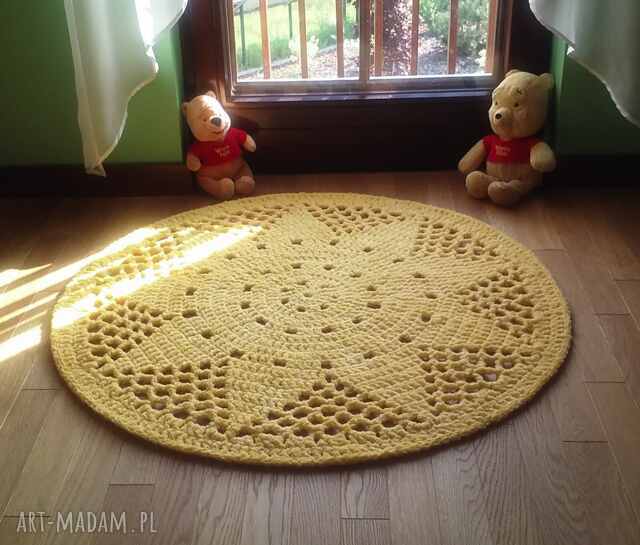 Dywan Słoneczko wykonany ręcznie, zakończony wzmocnionym brzegiem. Średnica 110 cm, kolor żółty.