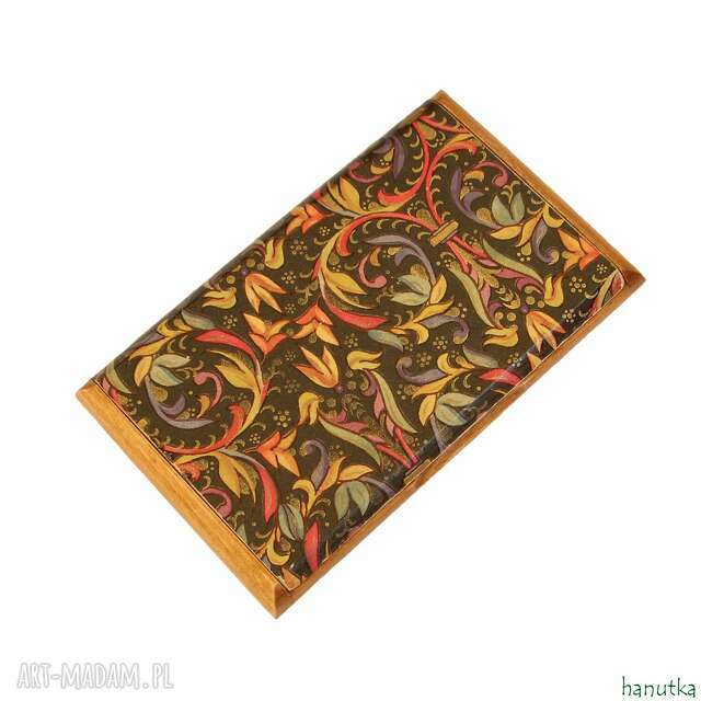 Elegancki drewniany wizytownik, bardzo lekki, ozdobiony na zewnątrz i wewnątrz techniką decoupage. Zamknięty - do noszenia w kieszonce lub torebce, otwarty - do postawienia na biurku. Bejcowany na orzech włoski, postarzany przecieraniem. Pokryty wieloma warstwami ekologicznego lakieru akrylowego z lekkim połyskiem.