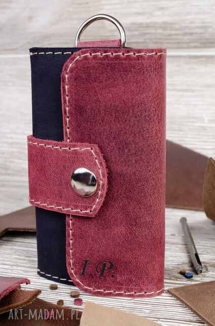 skórzane etui na klucze z grawerem, kolor bordowo - granatowy