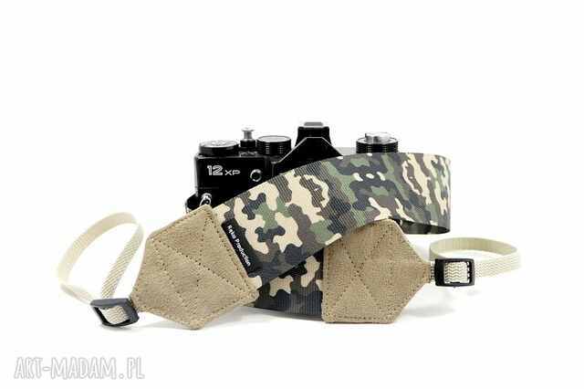 pasek do aparatu z kolorowej taśmy moro z beżem dla fotografa