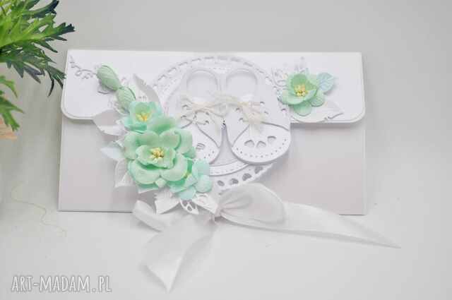 Kartka wykonana z wysokiej jakości perłowego papieru ozdobnego, zdobiona przestrzennymi elementami: białymi bucikami, delikatnymi kwiatami w odcieniu mięty, ażurowymi wycinankami i listkami. Całość tworzy harmonijną, elegancką kompozycję o klasycznym charakterze.