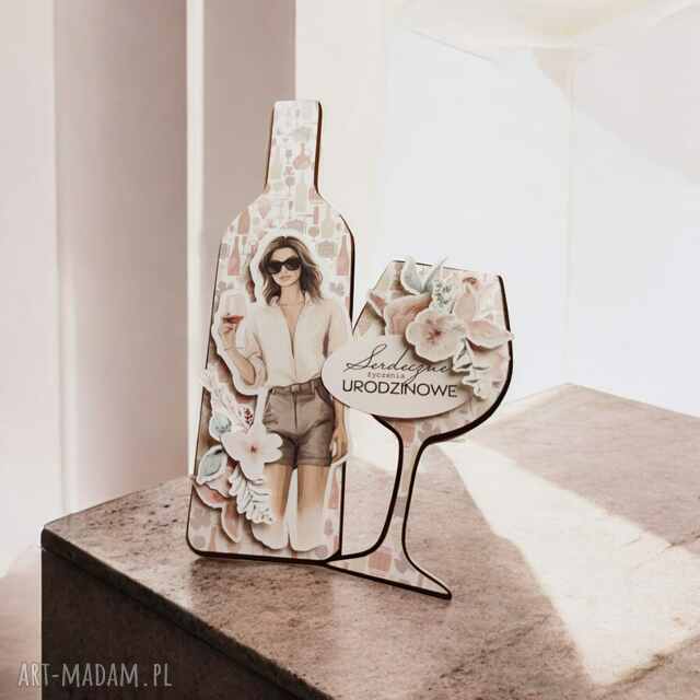 kartka urodzinowa, butelka wina z kieliszkiem, w pudełku z okienkiem