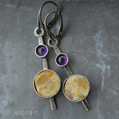 Srebrne kolczyki wiszące tribal z mlecznym cytrynowym bursztynem. Żółte srebro oksydowane biżuteria. Minimalistyczne, lekkie kolczyki wiszące wykonane z oksydowanego srebra próby 925 oraz okrągłego bursztynu o średnicy 8 mm429,00 zł