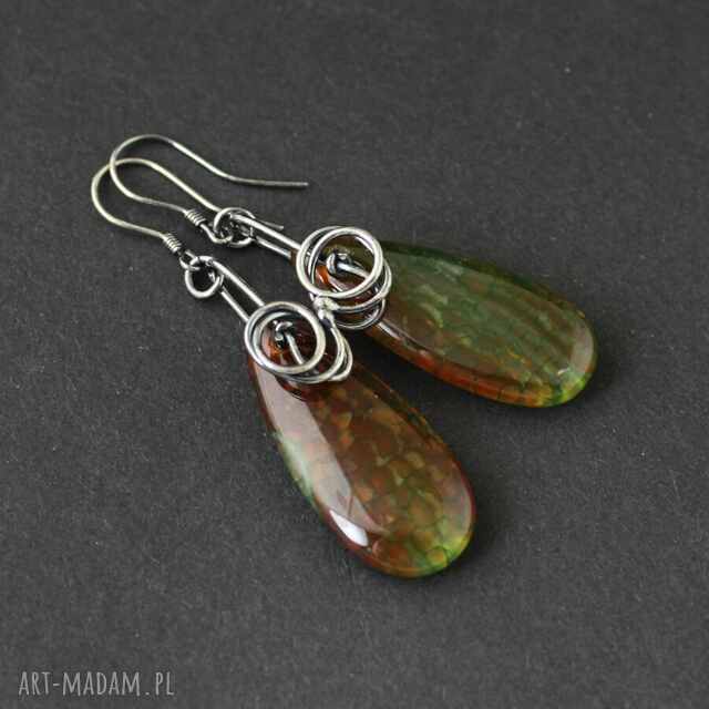 W tych kolczykach z oksydowanego srebra próby 925 zaklęto ciszę jesiennego lasu tuż przed zmierzchem. Długie na 6,2 cm, o szerokości 1,5 cm, niosą w sobie kroplowy kształt agatu - jakby dwie łzy światła spływały po pniu starego drzewa. Kamień pulsuje mozaiką barw: głęboka zieleń przypomina omszałe skały i liście przykryte cieniem, zaś ciepła rudość miesza się z miodowym brązem, jak zachodzące słońce odbite w leśnym strumieniu. Wzór delikatnie popękanej struktury wprowadza wrażenie organicznej, niemal zwierzęcej energii - jakby agat oddychał własnym rytmem.