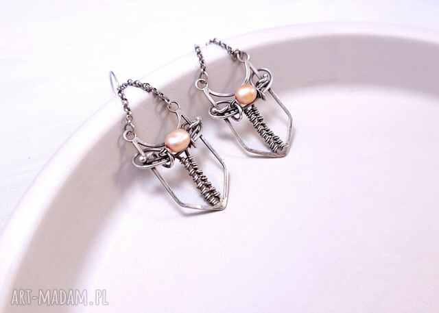 Te wyjątkowe kolczyki zostały wykonane ręcznie ze srebra próby 925. Centralnym punktem kompozycji jest subtelna naturalna perła o różowym odcieniu, dodająca całości delikatności i elegancji.