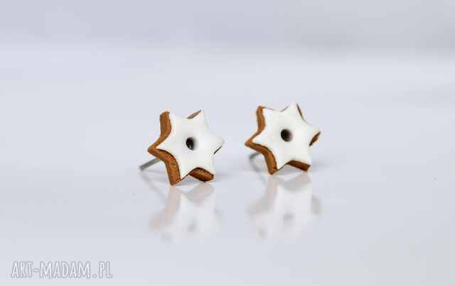 Subtelne i pełne zimowego uroku kolczyki w kształcie małych piernikowych gwiazdek z klasycznym, białym lukrem. Model wykonany w całości ręcznie, z dbałością o każdy detal - od drobnych rantów pierniczka po gładką powierzchnię lukru, która pięknie odbija światło.