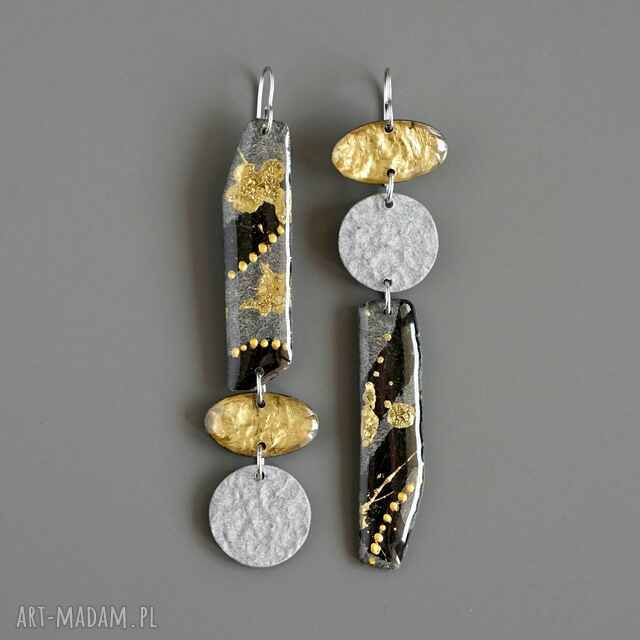Sześć ręcznie wykonanych elementów tworzy asymetryczne, niepowtarzalne kolczyki w eleganckim, lekko industrialnym stylu.