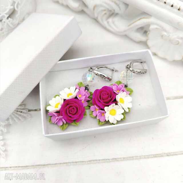 długie wiszące kolczyki z rumiankami i różami, kryształki, kolczyki eleganckie