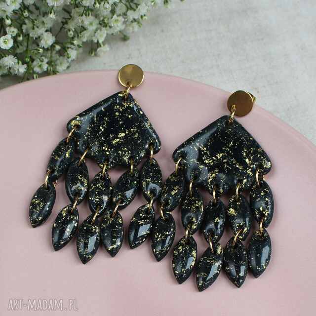 Eleganckie kolczyki z kolekcji BLACK STONE wykonane ręcznie z gliny polimerowej utwardzonej w temp. 120 st. C., pokryte nadającą połysk warstwą żywicy. Wykończone elementami ze stali chirurgicznej w kolorze złotym.