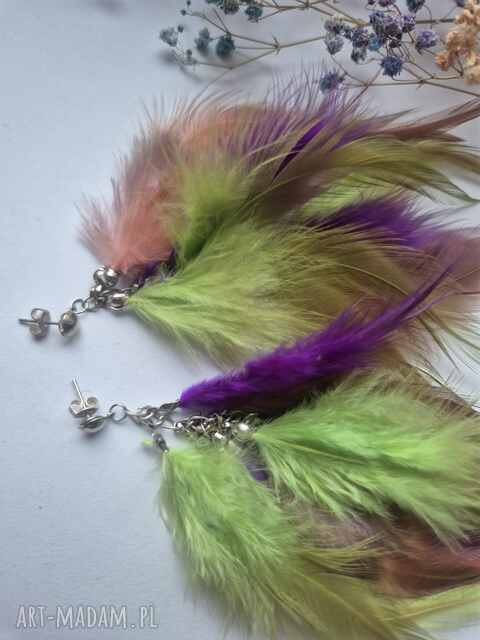 Kolczyki delikatne leciutkie pióra zielono-fioletowe rękodzieło polecam