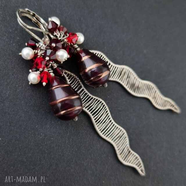 Te wyjątkowe kolczyki, przypominające soczyste czerwone grona, zostały w całości wykonane ręcznie z zastosowaniem niezwykle precyzyjnej i pracochłonnej techniki wire-wrapping. Polega ona na misternym oplataniu grubszego drutu cieńszym drucikiem, co nadaje biżuterii delikatny, a zarazem bogaty wygląd. Całość została lekko zaoksydowana (przyciemniona), a następnie starannie wypolerowana, aby miejscami wydobyć blask jasnego srebra, podkreślając kontrast i detale.