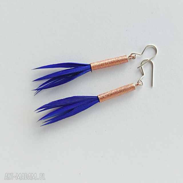 PIÓRKO - stylowy dodatek. Połączenie lekkości piórka i trwałości metalu. Metal niezwykle kontrastuje z naturalnym barwionym puchem. Kolczyki wykonane są z miedzi, naturalnie barwione pióra. Miedź - zmatowiony. Bigle otwarte - srebro pr. 925. Długość z biglami - 7,5 cm. Szerokość - 2cm.