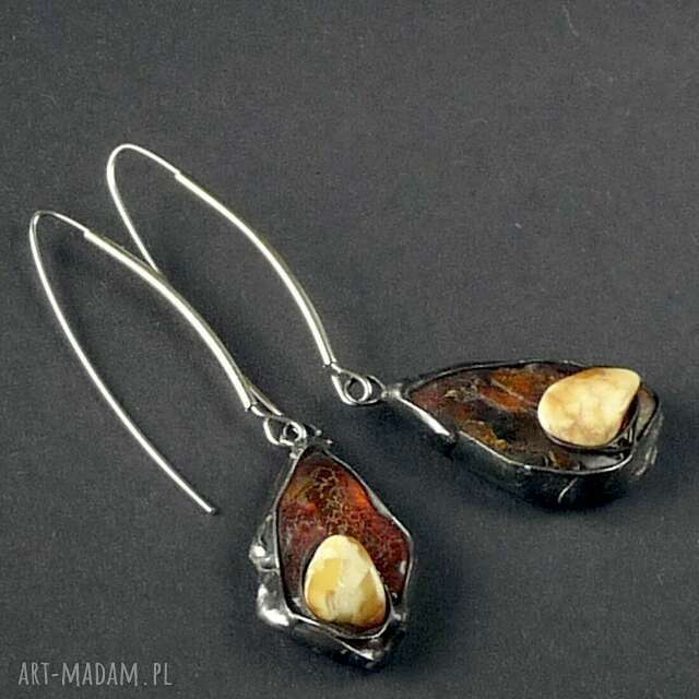 Srebrne kolczyki z bursztynem i ametystem. Wielkość plasterka bursztynu to 1,4 cm, natomiast kaboszon ametystu to 6 mm, 6 cm295,00 zł