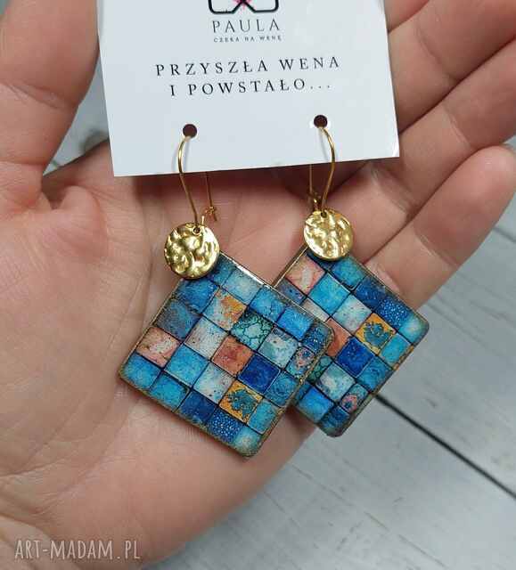 Wakacyjne kolczyki decoupage z motywem mozaiki. Kolczyki wyglądają zjawiskowo ponieważ sam decoupage jest dwustronny, podmalowany i zalany żywicą. Końcowy efekt jest szklany, ceramiczny. Kolczyki są wykonane ze sklejki, lekkie i wygodne w noszeniu.