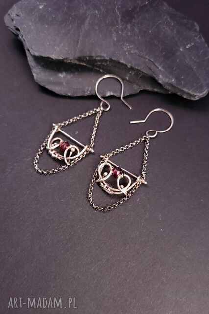 Poznaj wyjątkowe kolczyki wykonane ręcznie techniką wire wrapping, które łączą elegancję srebra z głęboką, szlachetną barwą granatu.