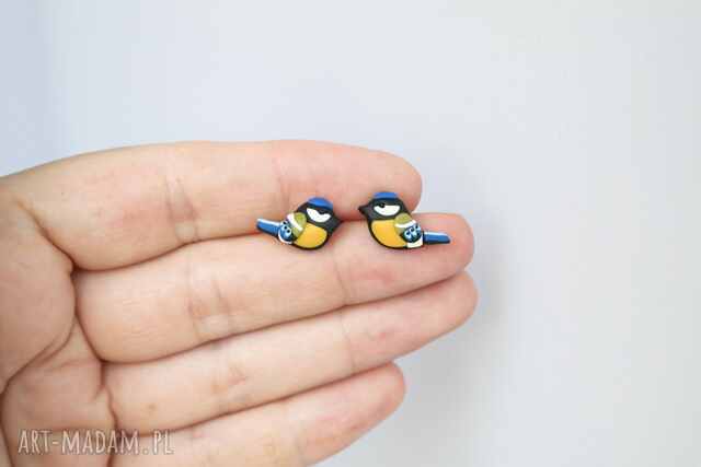 Ręcznie ulepione kolczyki w kształcie sikorek.