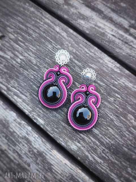 kolczyki sutasz czarno fioletowe z ozdobnym sztyftem