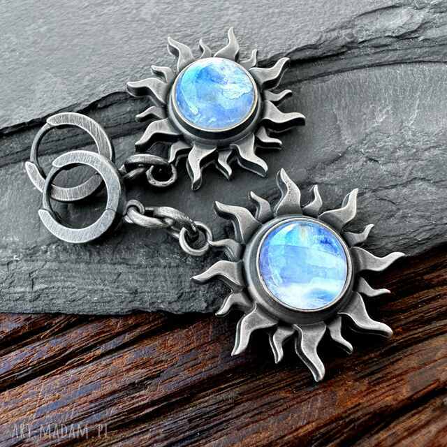 srebrne kolczyki symbol słońca z kamieniem księżycowym 11 mm