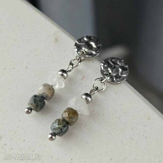Inspirowane morskim nabrzeżem kolczyki łączące modne wzornictwo z unikatowymi barwami i formą kamieni naturalnych. W dumortierycie znajdziesz wszystkie kolory piaszczystego nabrzeża, a kamień księżycowy zachwyci Cię swoim kształtem - nieregularnym, lekko surowym i bliskim naturze. Całość zawieszona na modnych biglach w formie gniecionej płytki, pięknie odbijającej światło.