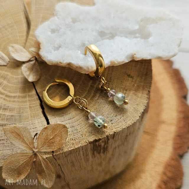 Kolczyki, które łączą w sobie zarówno baśniowy klimat, jak i nowoczesną formę. Fluoryt i frenit w delikatnych, romantycznych odcieniach liliowego i zieleni, zawieszone zostały na biglach - kajdankach ze stali szlachetnej, które nadają całości nowoczesny styl. Całość uzupełniona została delikatnymi dodatkami ze stali szlachetnej w kolorze złotym.