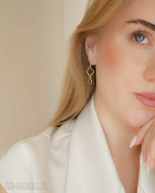 Wiszące, ażurowe kolczyki z kwarcem dymnym wykonane w całości ze srebra 925. Złocone 24k złotem. Zapięcie nas ztyft z kuleczką.