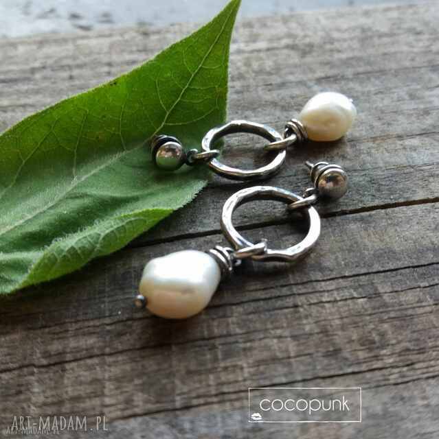Nowoczesne kolczyki wykonane w całości ze srebra pr. 925 ( młotkowanego, przyciemnianego, polerowanego). Zdobią je śliczne białe perły hodowlane wielkości 1cm, o nieregularnym, bardzo ciekawym kształcie. Długość całkowita kolczyków- 4,2cm. Waga jednego kolczyka- 2,5grama. Serdecznie polecam!