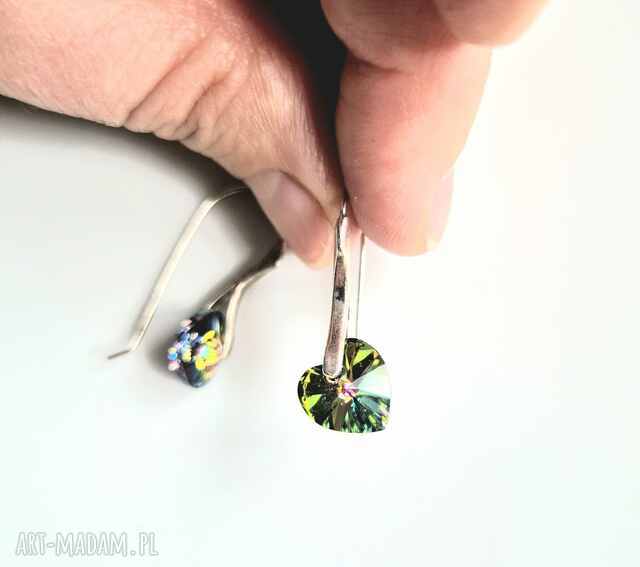 kolczyki zielony kryształowe serca eleganckie wykonane w pojedynczym egzemplarzu box