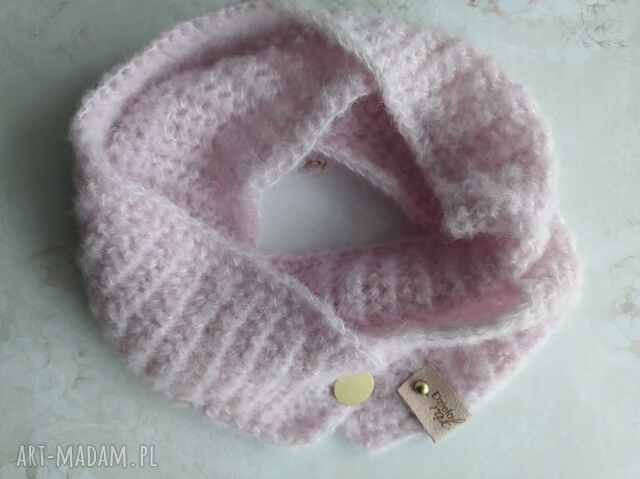 Delikatny szal z alpaki i jedwabiu wykonałam na szydełku. Wąski szal - komin, który jest połączony guzikiem na końcach. Będzie odpowiedni do płaszcza wiosennego lub letniej kurtki.