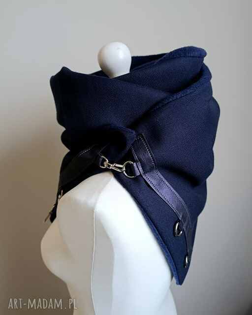 Bardzo starannie wykonany szal zapinany na 3 karabińczyki. Szal zostały wykonany z 2 warstw materiału - wierzchnia- granatowa tkanina wełniana, spód z granatowego, miłego w dotyku polaru. Szal zdobiony jest naturalną, granatową, metaliczną skórą oraz metalowymi zapięciami.