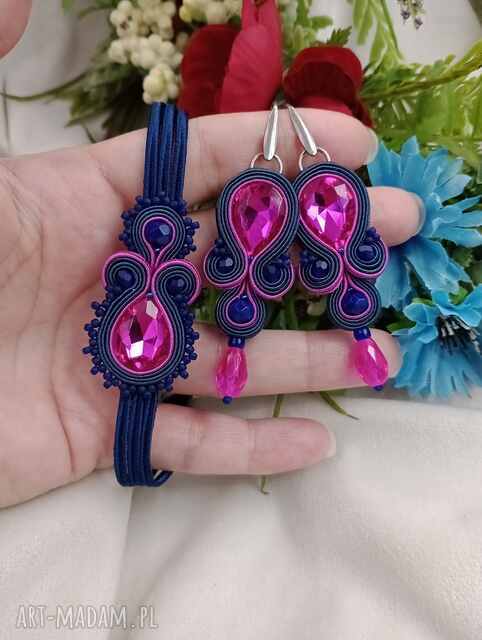 fuksja i granat, komplet biżuterii soutache kolczyki i bransoletka róż i granatowy