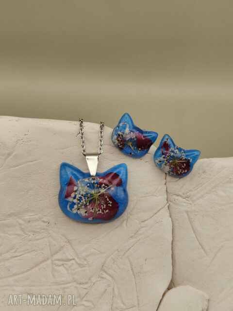Wyjątkowy komplet biżuterii inspirowany kocim motywem, wykonany z transparentnej żywicy w intensywnym odcieniu błękitu. Wewnątrz zatopione są naturalne, suszone kwiaty, które nadają całości artystycznego i niepowtarzalnego charakteru. Komplet przyciąga wzrok, łącząc delikatność natury z oryginalną formą - idealny dla miłośniczek kotów i biżuterii handmade.