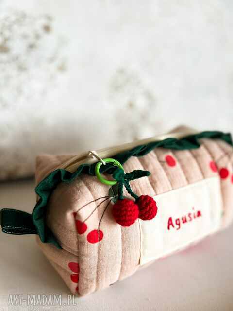 ręczne wykonanie personalizowana kosmetyczka z imieniem i zawieszką