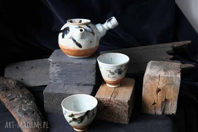 Czajniczek typu kyusu (ma uchwyt z boku) i 2 czarki z pieca na drewno. Ręcznie toczone, szkliwione - szkliwo z drobniutkimi wypukłościami. Kamionka, szkliwo popiołowe. Ręcznie malowane. Pojemność czajniczka ok. 550 ml, czarki ok. 200 ml.
