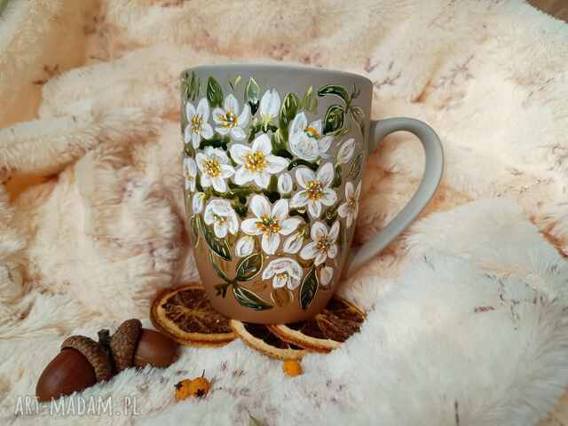 Ręcznie malowany kubek kwitnącym jaśminem.