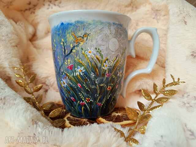 Ręcznie malowany kubek z łąką o świcie to przepiękna propozycja dla wrażliwych, sentymentalnych i delikatnych dusz.