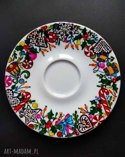 Niesamowicie kolorowa ręcznie malowana filiżanka ze spodkiem to doskonały prezent pod choinkę, który sprawi radość każdej obdarowanej osobie.