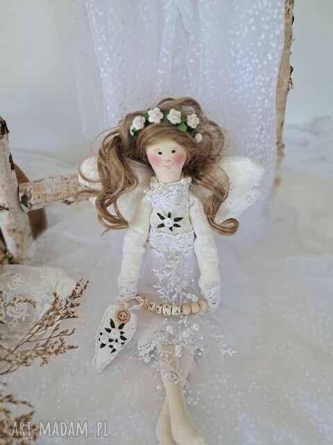 Witam serdecznie:) Mam do sprzedaży własnoręcznie uszytą anielicę w kolorze bieli i ecru. Sukienka wykonana z lnu oraz dodatkowa spódnica z białego tiulu. Udekorowana koronkami i wyszytymi białymi różyczkami. W rączce trzyma serduszko a na główce ma różaną opaskę;)Włosy ciemny blond, kręcone. Skrzydła udekorowane perełkami, co nadaje im wyjątkowości. Spódnica dodatkowo ozdobiona srebrną wstążką i białymi perełkami. Wysokość 47 cm.