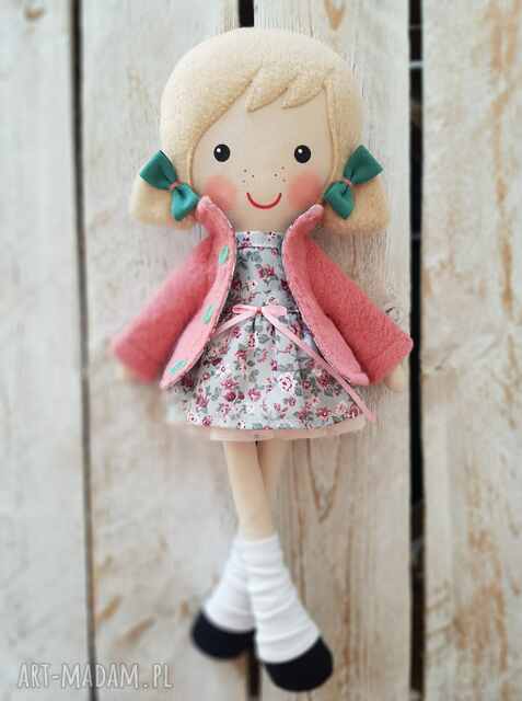 Laleczka ma buzię ręcznie malowaną niespieralnymi farbami akrylowymi do tkanin. Ubrana jest w kwiecistą sukienkę podszytą miękkim tiulem oraz flauszowy płaszczyk. Nogi lalki zdobią bawełniane getry i buciki. Całość tworzy kolorystyczną harmonię. Wszystkie ubranka są zdejmowane.