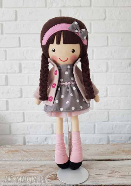Laleczka ma buzię ręcznie malowaną niespieralnymi farbami akrylowymi do tkanin. Ubrana jest w bawełnianą sukienkę podszytą miękkim tiulem oraz flauszowy płaszczyk. Nogi lalki zdobią bawełniane getry i filcowe buciki. Całość tworzy kolorystyczną harmonię. Wszystkie ubranka są zdejmowane.