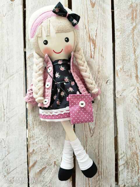 Laleczka ma buzię ręcznie malowana niespieralnymi farbami akrylowymi do tkanin.
