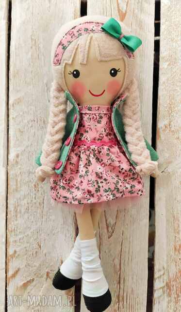 Laleczka ma buzię ręcznie malowaną niespieralnymi farbami akrylowymi do tkanin.
