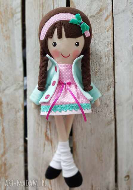 Laleczka ma buzię ręcznie malowana niespieralnymi farbami akrylowymi do tkanin.