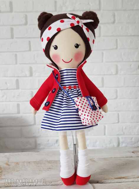 Ręcznie szyta bawełniana laleczka. Ubranka lali wykonane są z bawełny, flausz i tiulu. Włoski lali przewiązane są kropiastą i pasją, przez ramię przewiązaną ma bawełnianą listonoszkę.