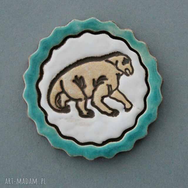 Magnes ceramiczny DINO w odcieniach turkusu, bieli, beżu i brązu. Idealny na prezent dla przyjaciela, dla kolekcjonera magnesów lub fana dinozaurów. Kolory na zdjęciach mogą się różnić, ze względów na ustawienia parametrów monitora.