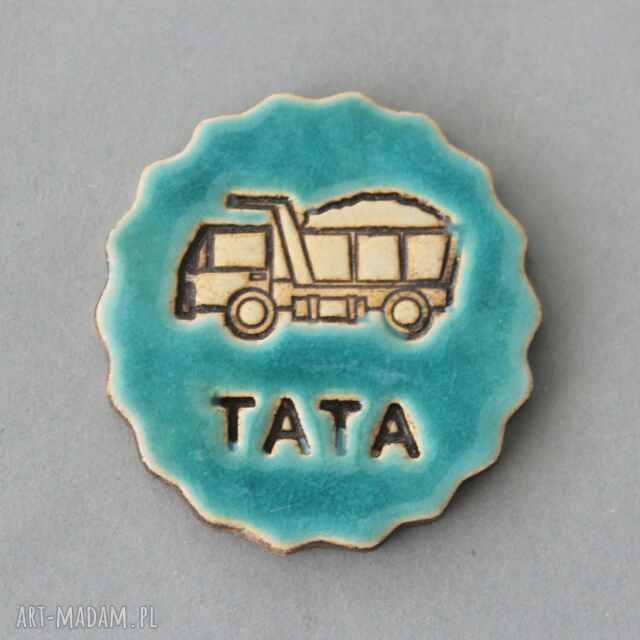 Śliczny, nieduży magnes ceramiczny TATA w turkusu czerwieni, beżu i brązu. Idealny na prezent dla taty lub jako dodatek do prezentu. Szkliwiony z jednej strony. Kolory na zdjęciach mogą się różnić, ze względów na ustawienia parametrów monitora.